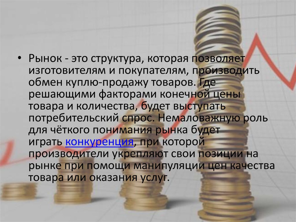 • Рынок - это структура, которая позволяетизготовителям и покупателям, производить