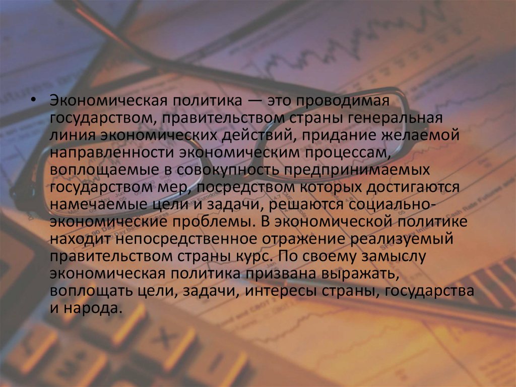 • Экономическая политика — это проводимаягосударством, правительством страны генеральная