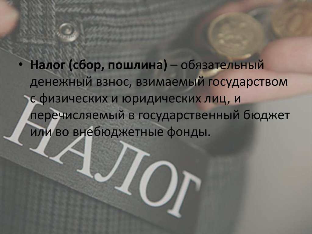 • Налог (сбор, пошлина) – обязательныйденежный взнос, взимаемый государством