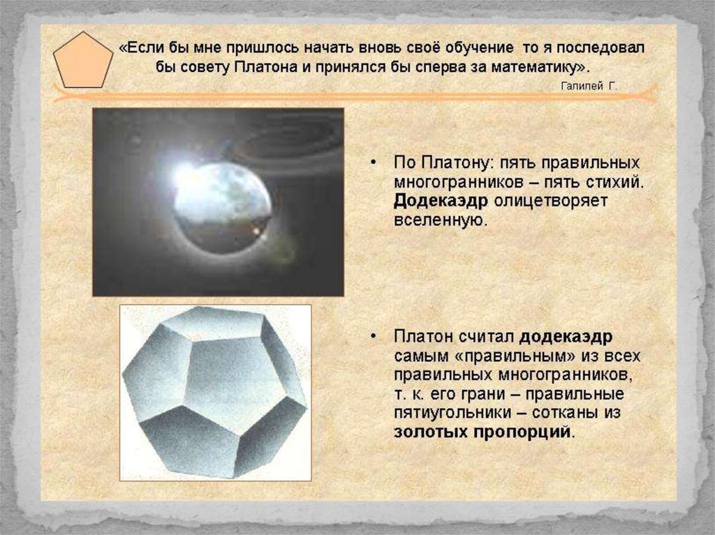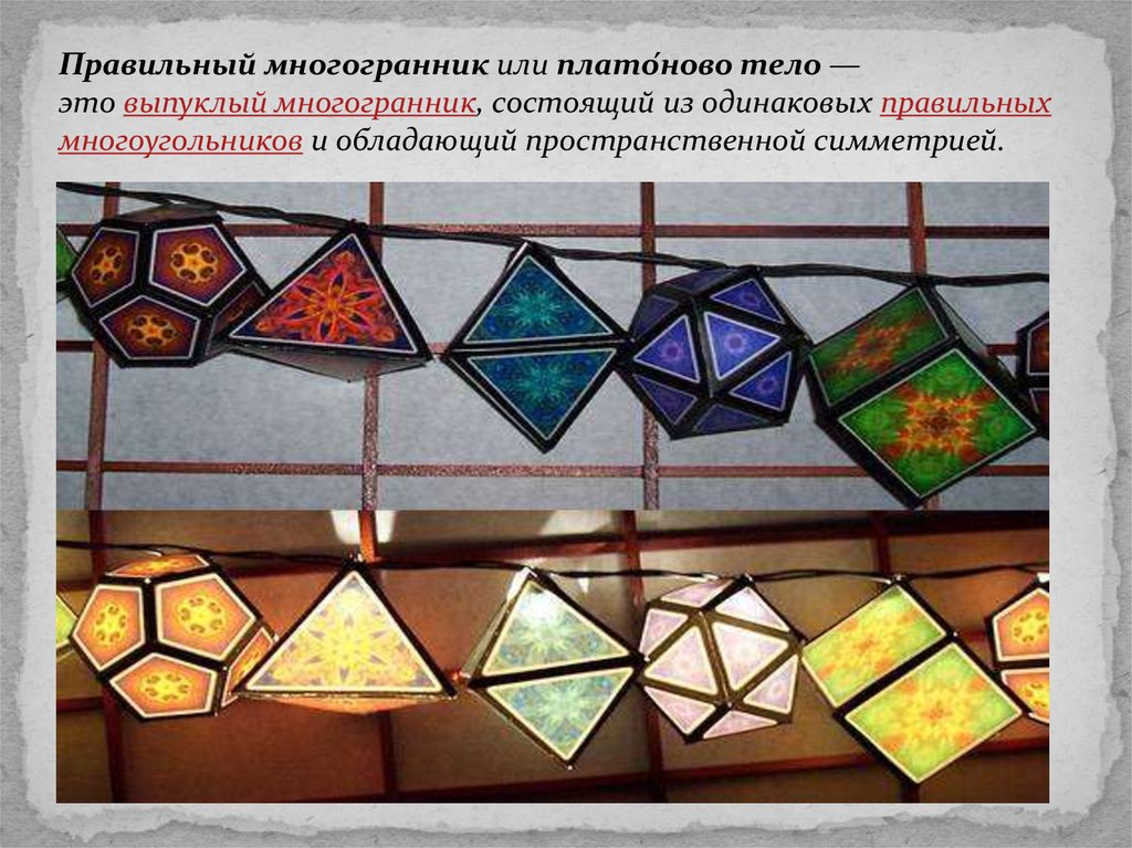 Правильный многогранник или плато́ново тело —это выпуклый многогранник, состоящий из одинаковых правильных