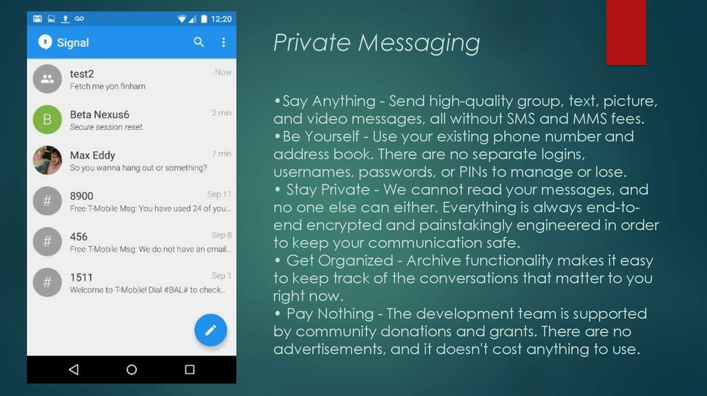 6. Private Messaging •Say Anything - Send high-quality group, text, picture, and video messages, all without SMS and MMS fees. •Be