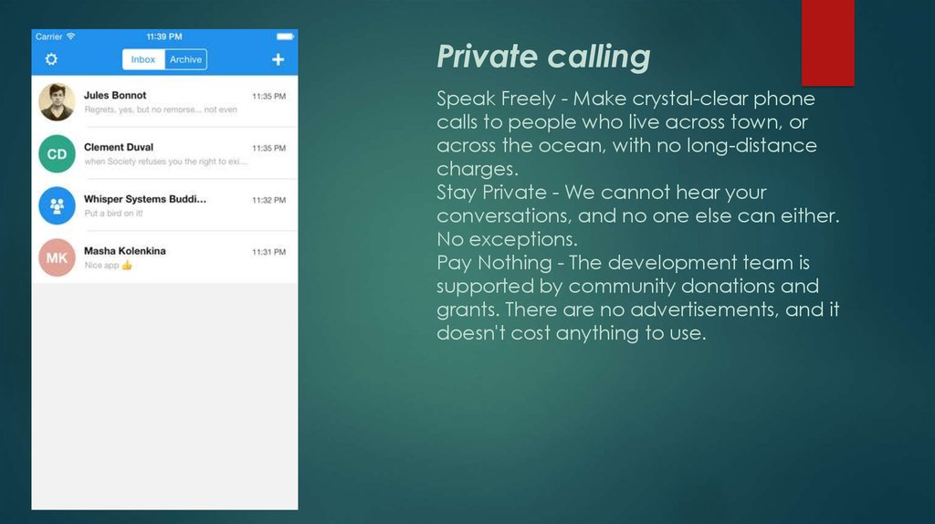 7. Private calling Speak Freely - Make crystal-clear phone calls to people who live across town, or across the ocean, with no