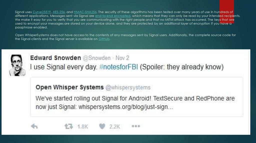 8. Signal uses Curve25519, AES-256, and HMAC-SHA256. The security of these algorithms has been tested over many years of use in