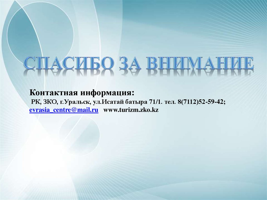 тел. 8(7112) 52-59-42; www.turizm.zko.kz; evrasia_centre@mail.ru