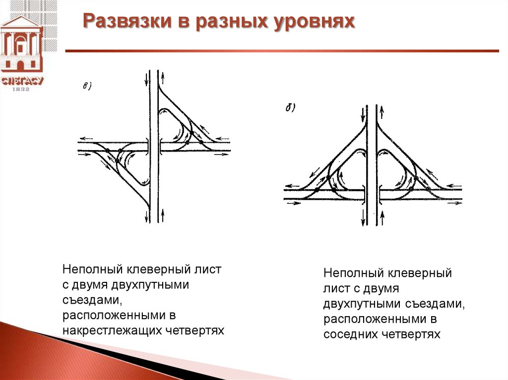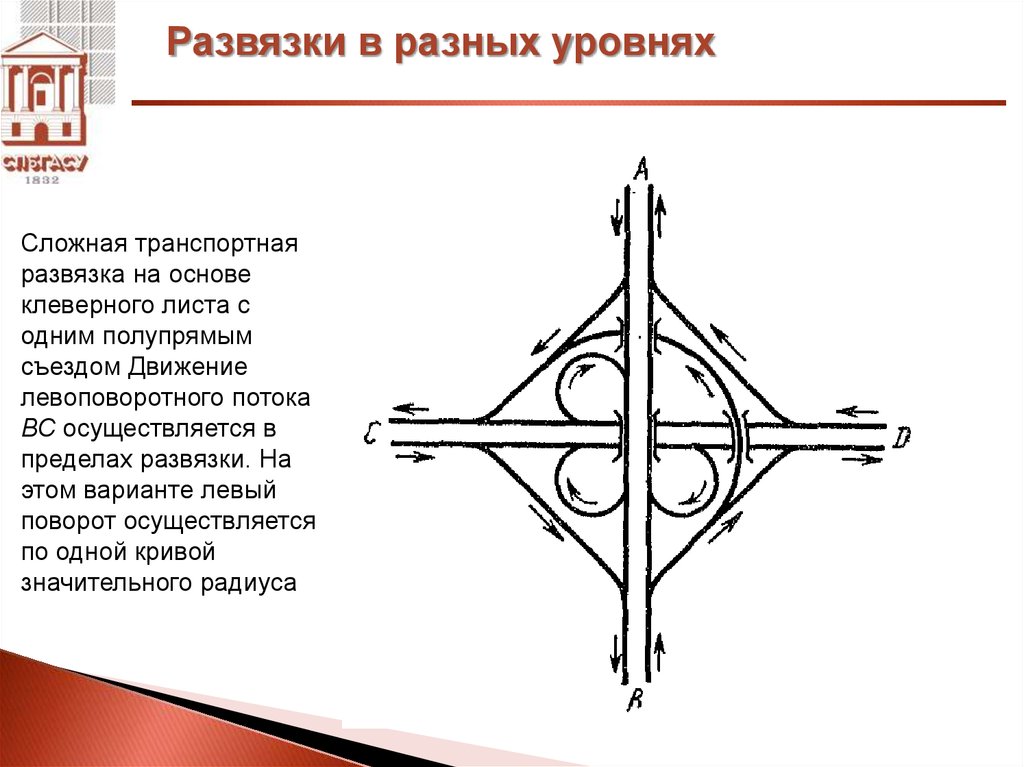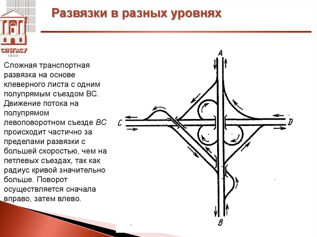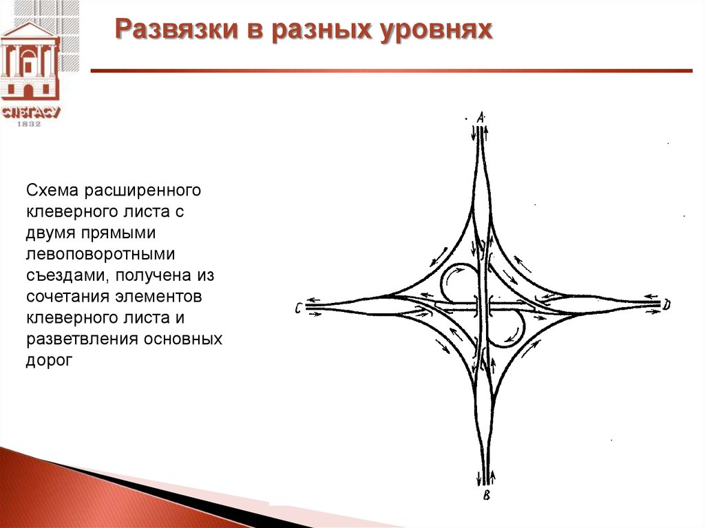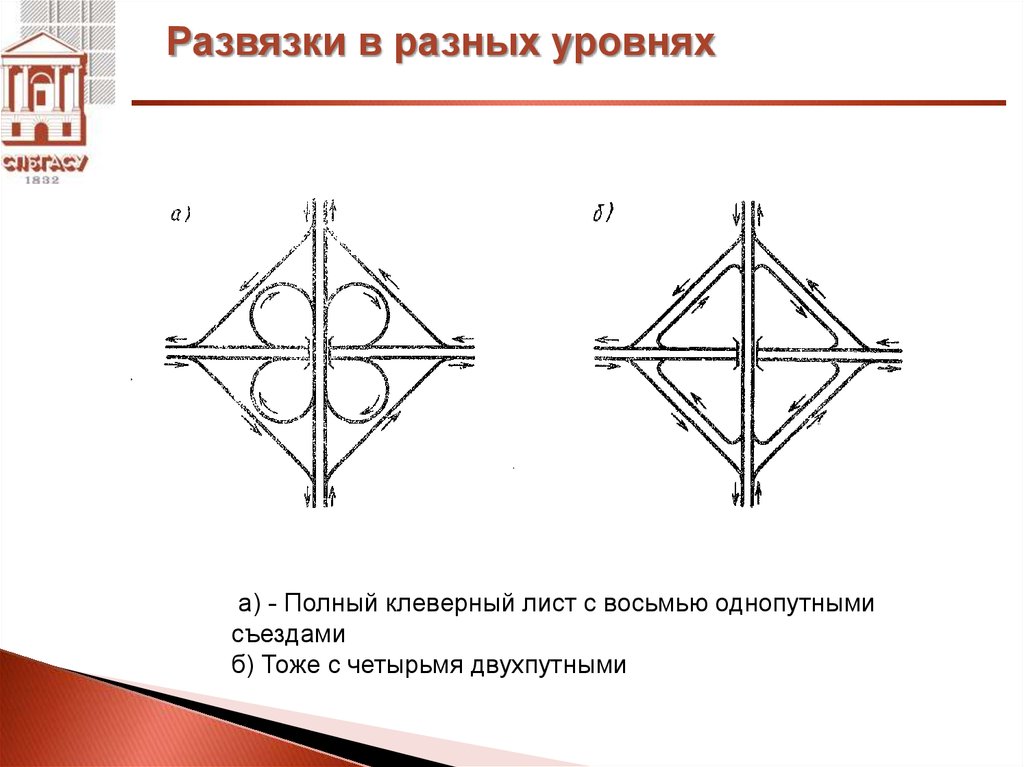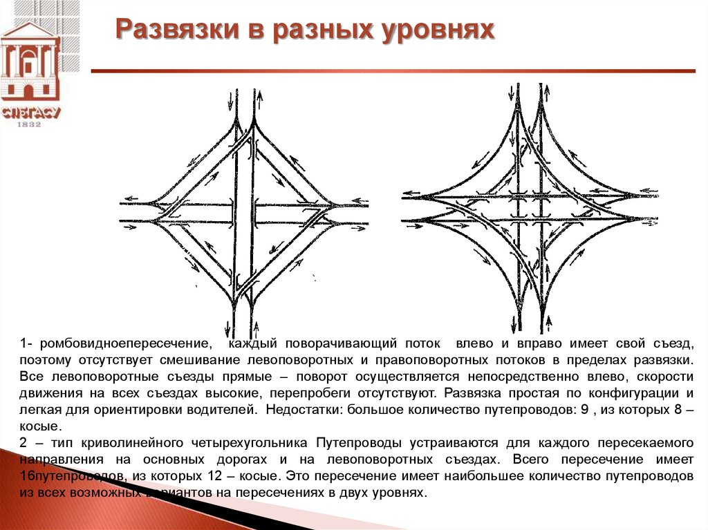 Развязки в разных уровнях1- ромбовидноепересечение, каждый поворачивающий поток влево и вправо имеет свой съезд,