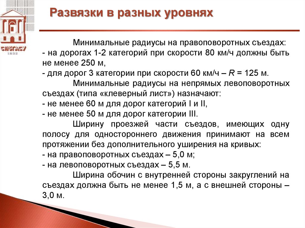 Развязки в разных уровняхМинимальные радиусы на правоповоротных съездах: