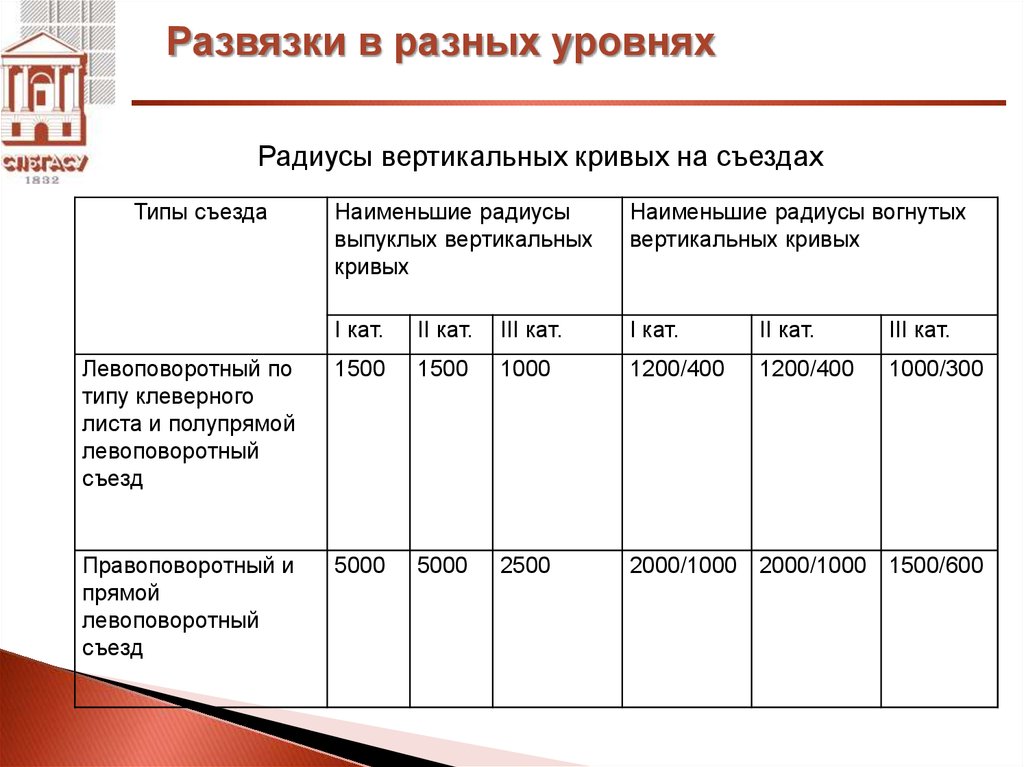 Развязки в разных уровняхРадиусы вертикальных кривых на съездах