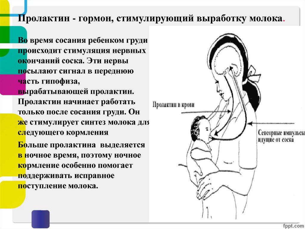 Пролактин - гормон, стимулирующий выработку молока.Во время сосания ребенком груди