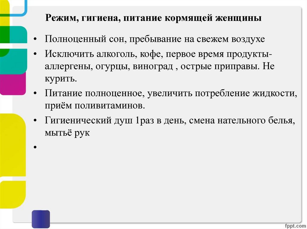 Режим, гигиена, питание кормящей женщины• Полноценный сон, пребывание на свежем воздухе