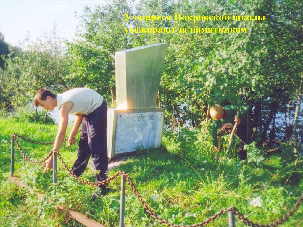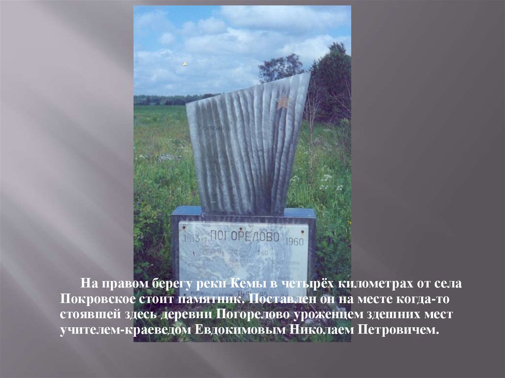На правом берегу реки Кемы в четырёх километрах от селаПокровское стоит памятник. Поставлен он на месте когда-то