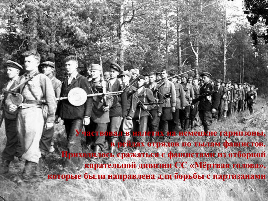 Участвовал в налетах на немецкие гарнизоны,в рейдах отрядов по тылам фашистов.