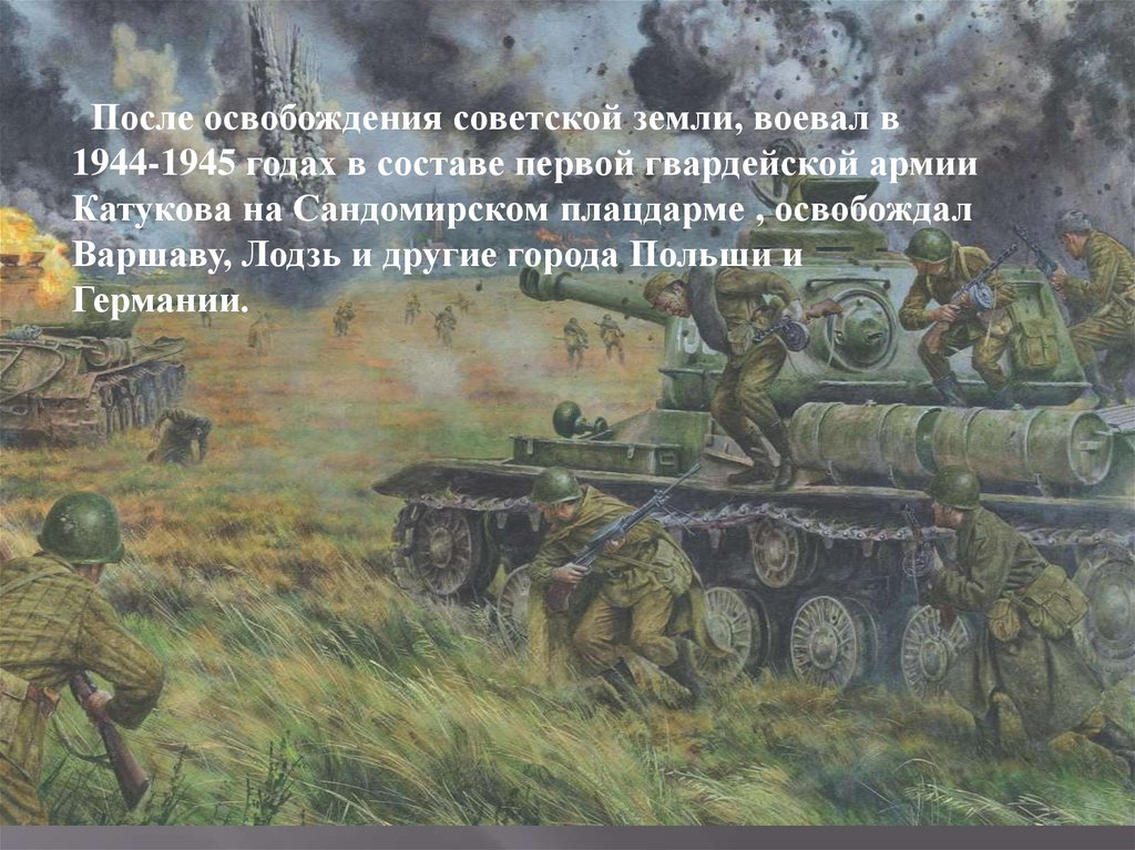 После освобождения советской земли, воевал в1944-1945 годах в составе первой гвардейской армии