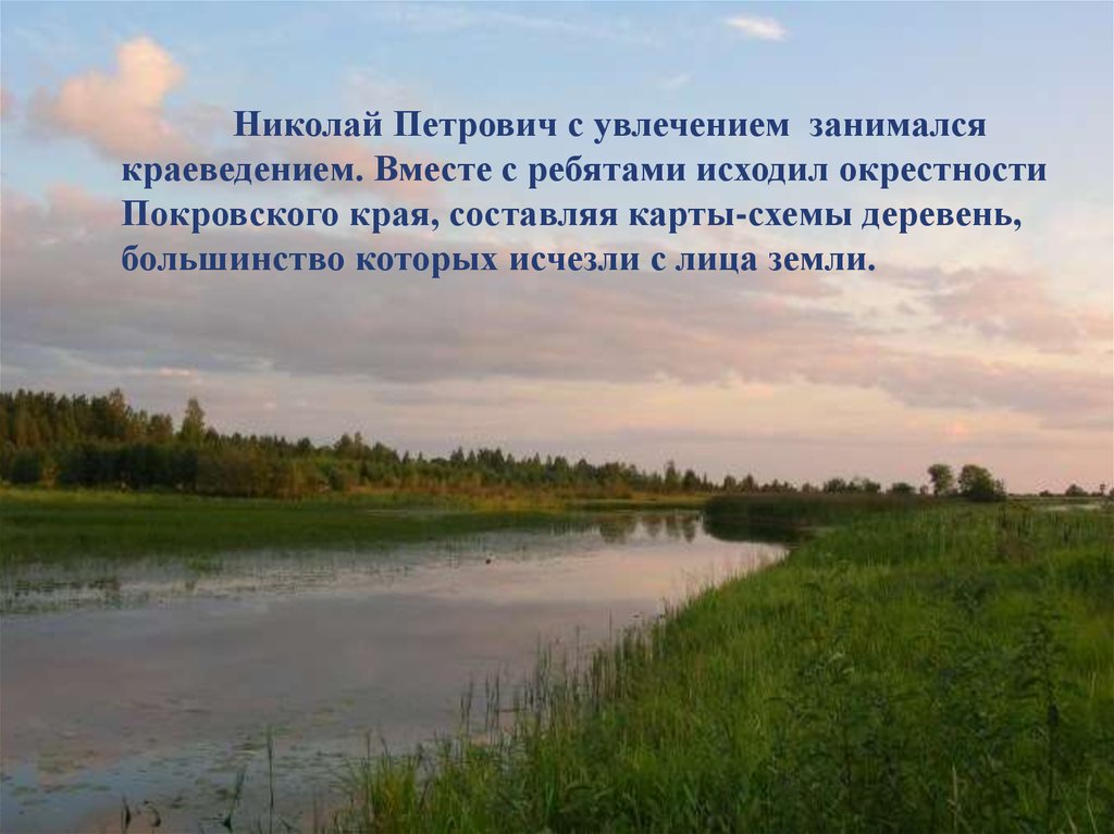 Николай Петрович с увлечением занималсякраеведением. Вместе с ребятами исходил окрестности