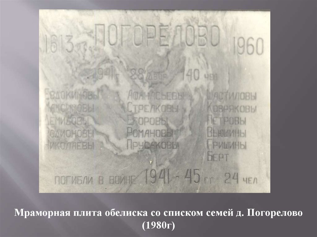 Мраморная плита обелиска со списком семей д. Погорелово(1980г)