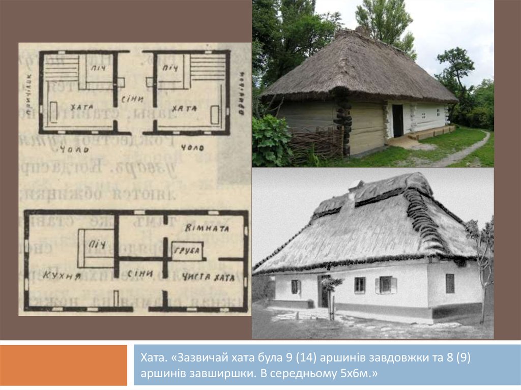 Хата. «Зазвичай хата була 9 (14) аршинів завдовжки та 8 (9)аршинів завширшки. В середньому 5х6м.»