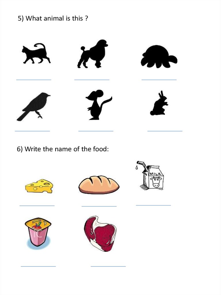 5) What animal is this ?6) Write the name of the food: