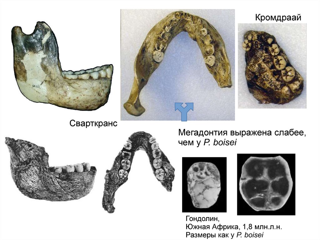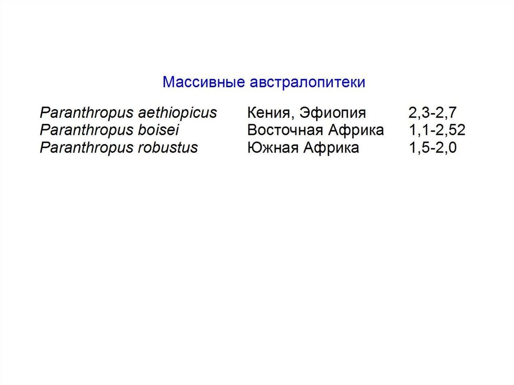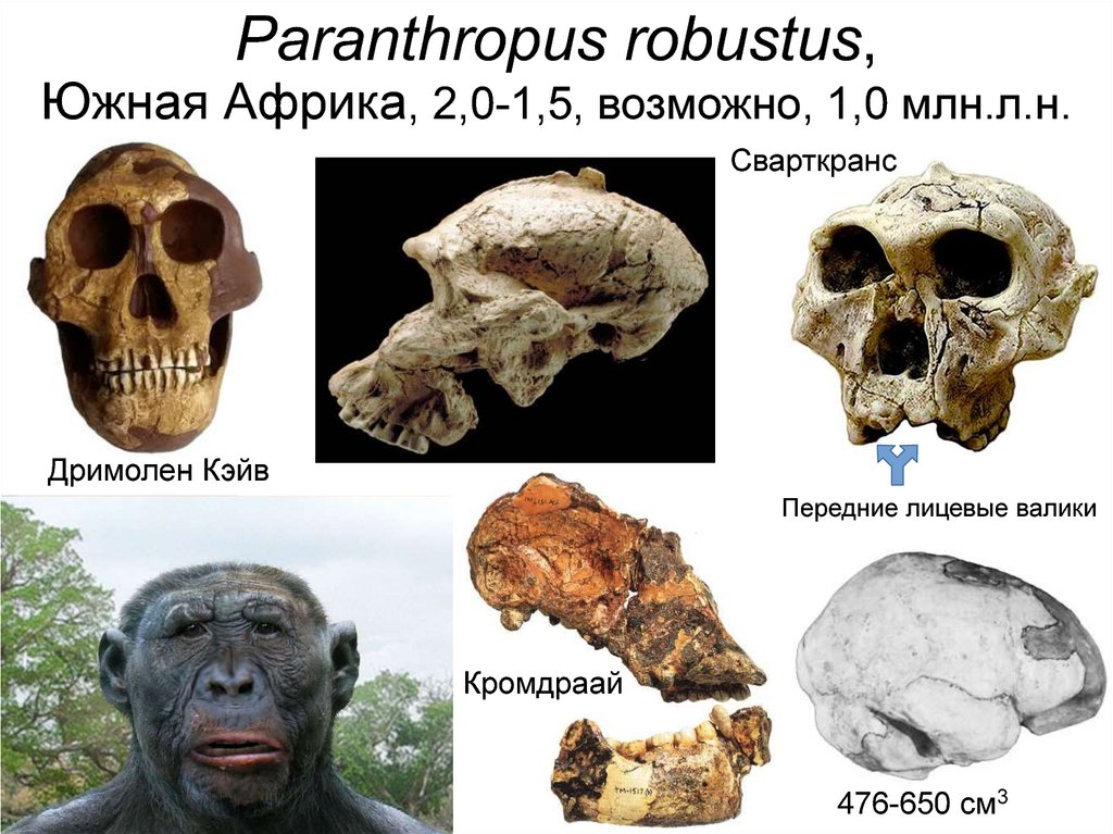 Paranthropus robustus,Южная Африка, 2,0-1,5, возможно, 1,0 млн.л.н.