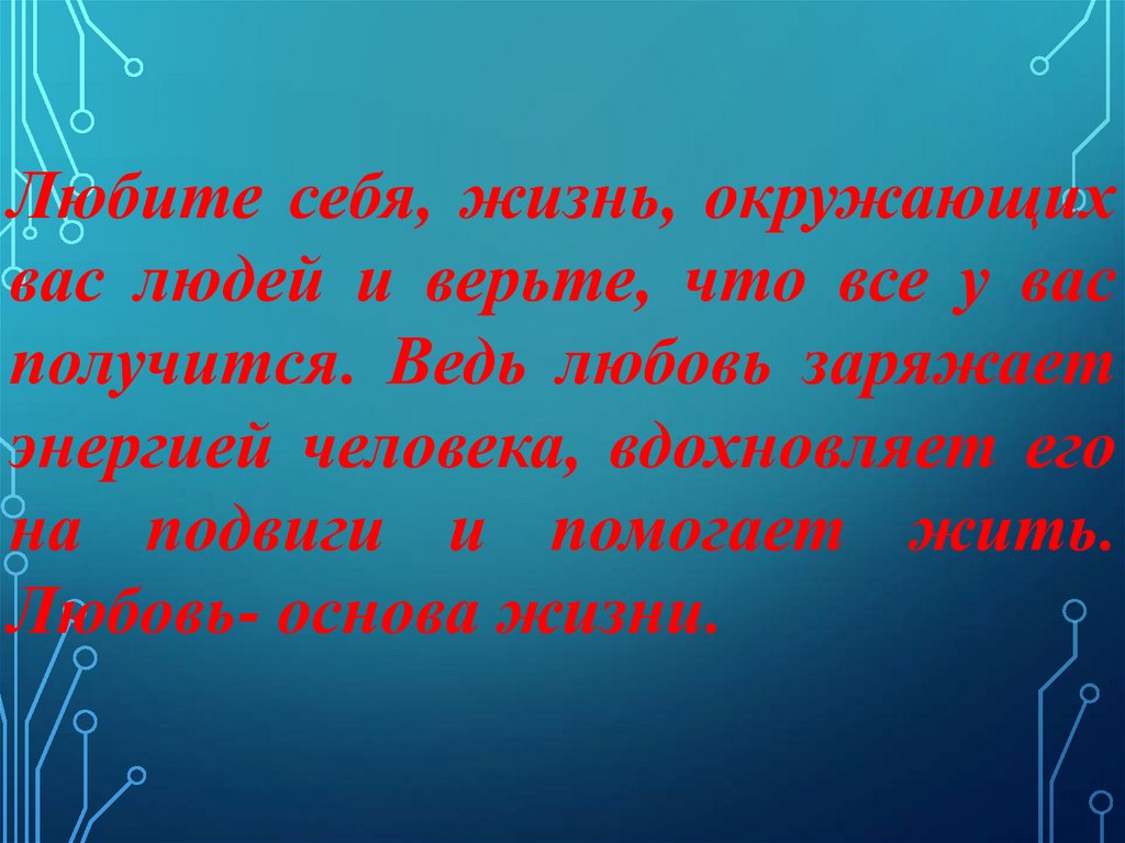 Любите себя, жизнь, окружающихвас людей и верьте, что все у вас