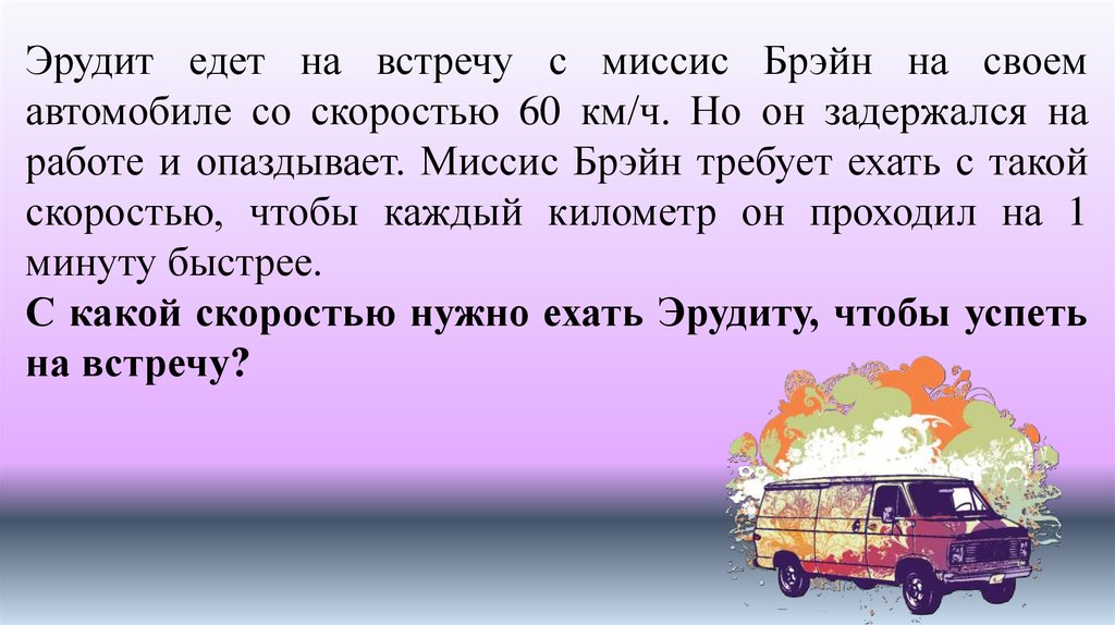 Эрудит едет на встречу с миссис Брэйн на своемавтомобиле со скоростью 60 км/ч. Но он задержался на