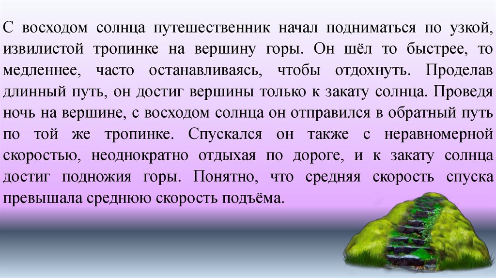 С восходом солнца путешественник начал подниматься по узкой,извилистой тропинке на вершину горы. Он шёл то быстрее, то