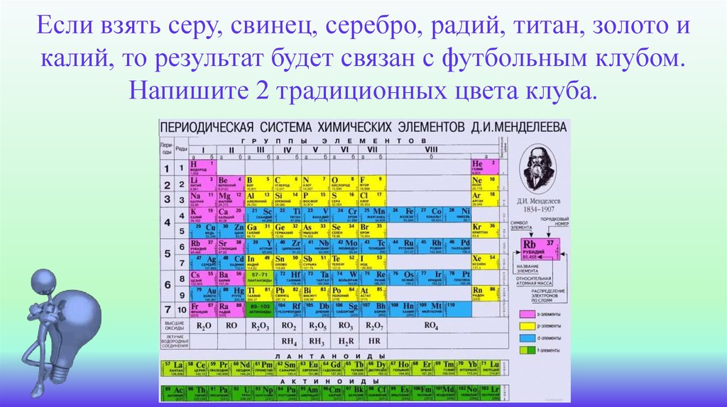 Если взять серу, свинец, серебро, радий, титан, золото икалий, то результат будет связан с футбольным клубом.