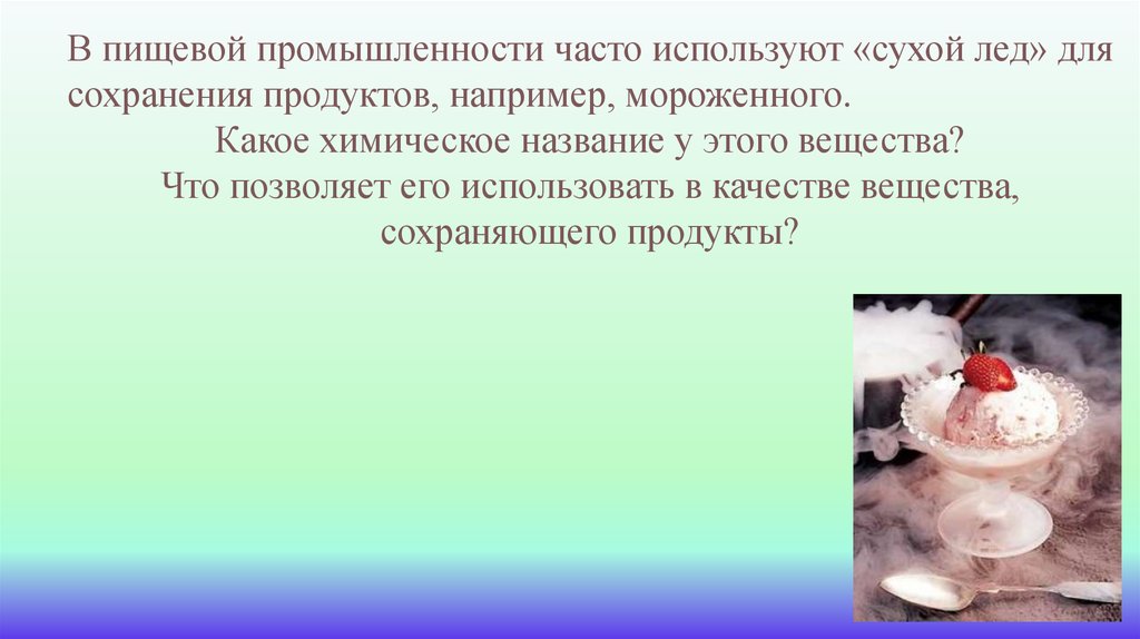 В пищевой промышленности часто используют «сухой лед» длясохранения продуктов, например, мороженного.