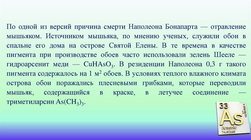 гидроарсенит меди — CuHAsO3. В резиденции Наполеона 0,3 г такого