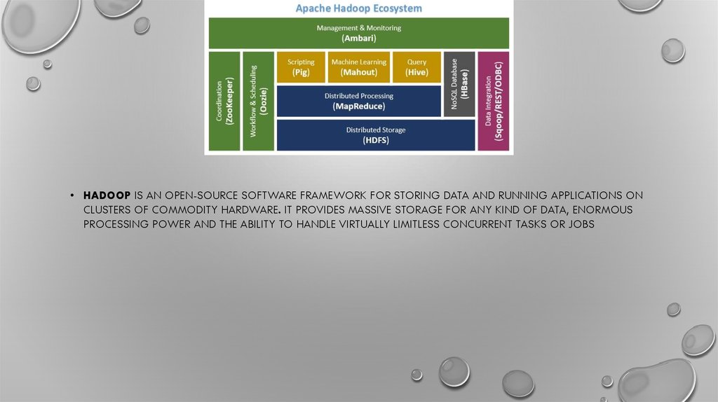 • HADOOP IS AN OPEN-SOURCE SOFTWARE FRAMEWORK FOR STORING DATA AND RUNNING APPLICATIONS ONCLUSTERS OF COMMODITY HARDWARE. IT PROVIDES MASSIVE STORAGE FOR ANY KIND OF DATA, ENORMOUS