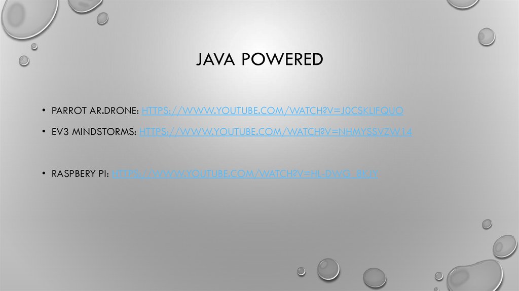 JAVA POWERED• PARROT AR.DRONE: HTTPS://WWW.YOUTUBE.COM/WATCH?V=J0CSKLIFQUO