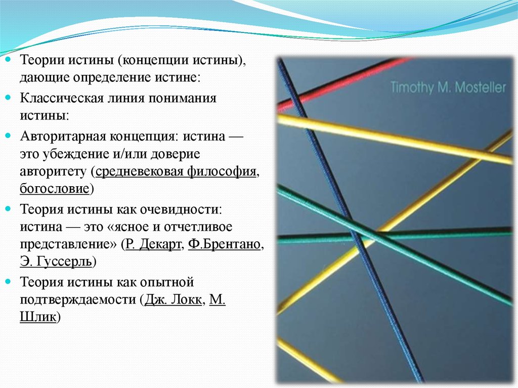 В философии, понятие истины совпадает с комплексом базовыхконцепций, позволяющих различить достоверное и недостоверное