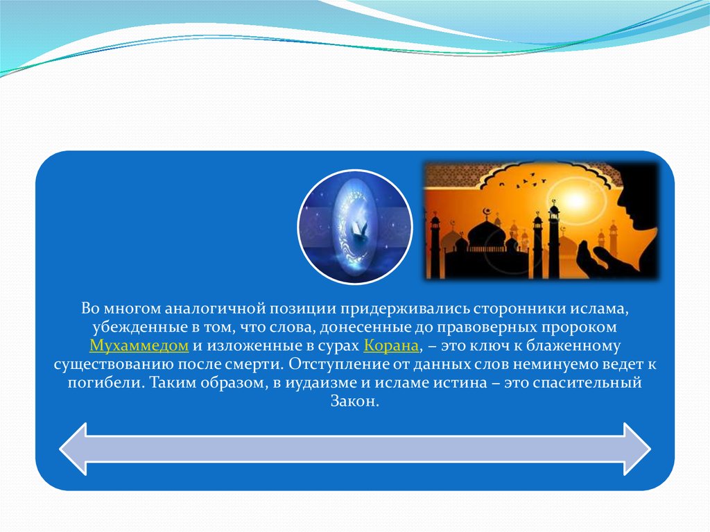 Во многом аналогичной позиции придерживались сторонники ислама,убежденные в том, что слова, донесенные до правоверных пророком