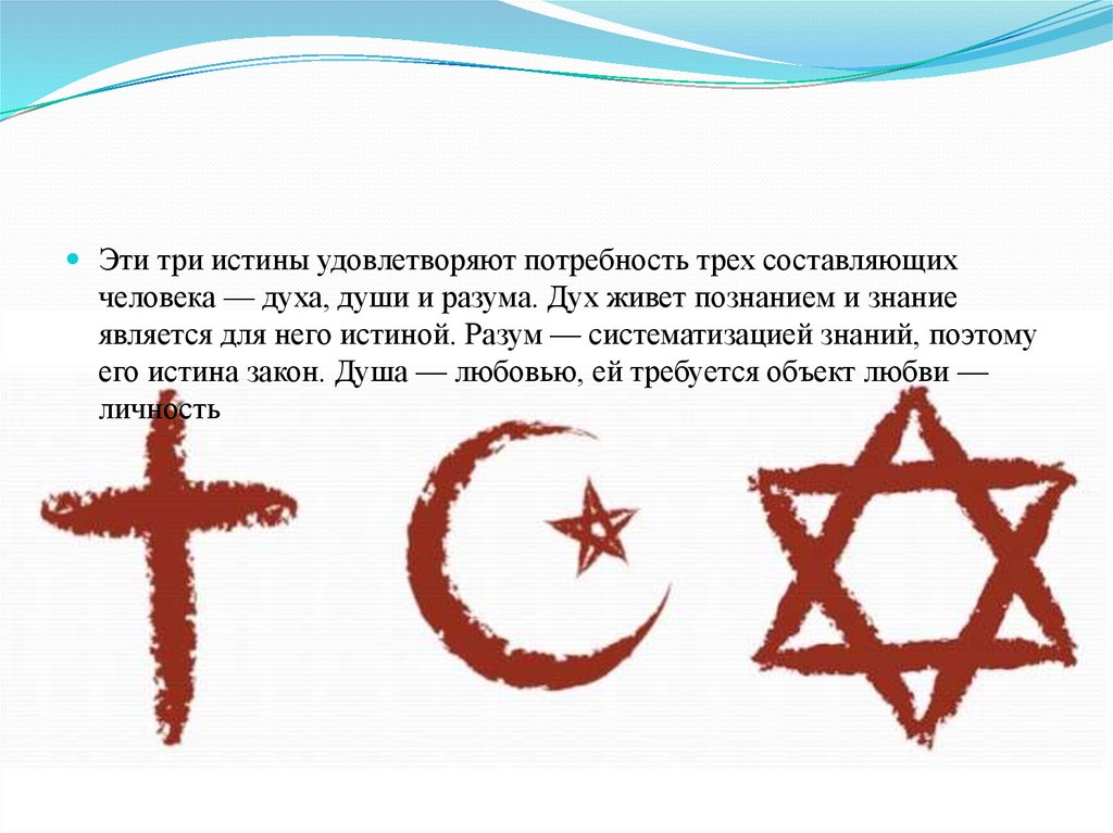 Эти три истины удовлетворяют потребность трех составляющихчеловека — духа, души и разума. Дух живет познанием и знание