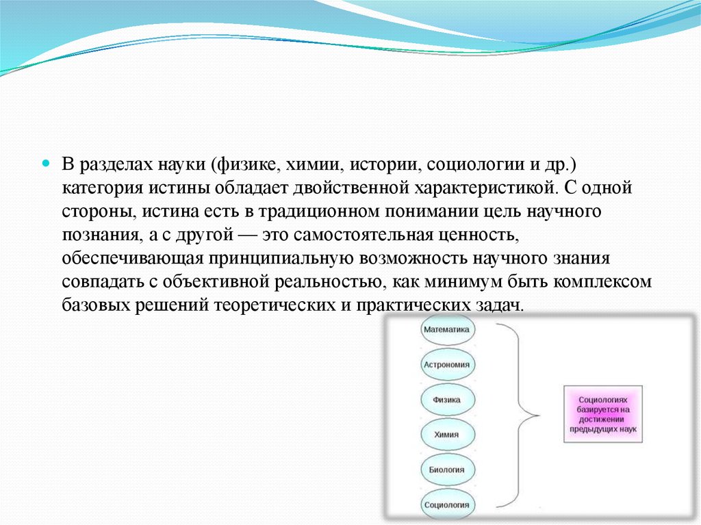В разделах науки (физике, химии, истории, социологии и др.)категория истины обладает двойственной характеристикой. С одной