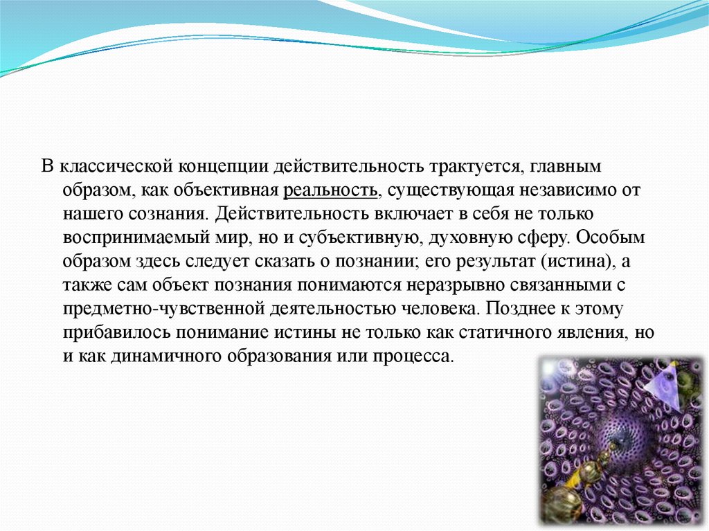 В классической концепции действительность трактуется, главнымобразом, как объективная реальность, существующая независимо от