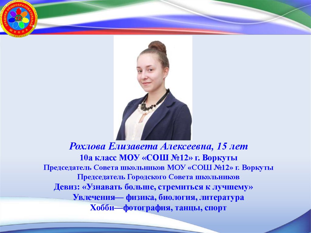 Рохлова Елизавета Алексеевна, 15 лет10а класс МОУ «СОШ №12» г. Воркуты
