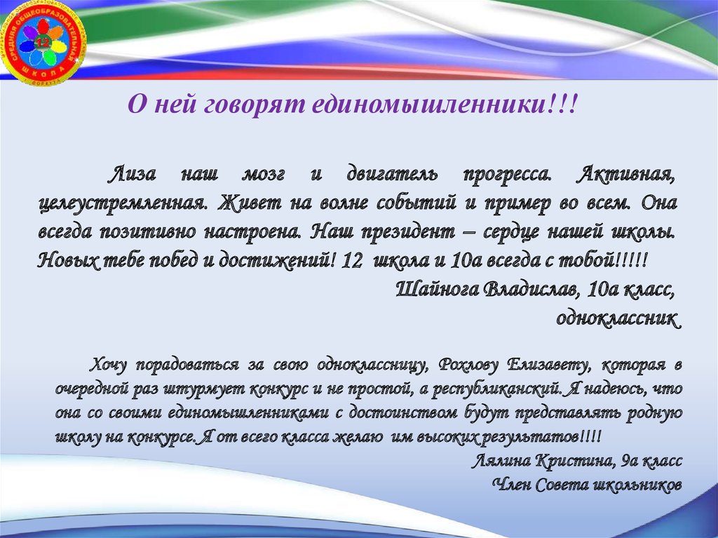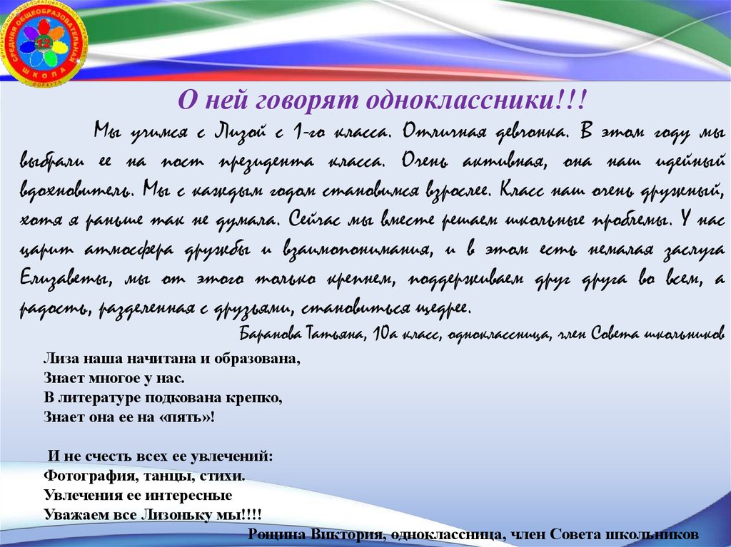 О ней говорят одноклассники!!!Мы учимся с Лизой с 1-го класса. Отличная девчонка. В этом году мы