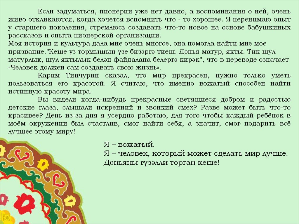 призвание."Кеше үз тормышын үзе бизәргә тиеш. Дөнья матур, якты. Тик шул