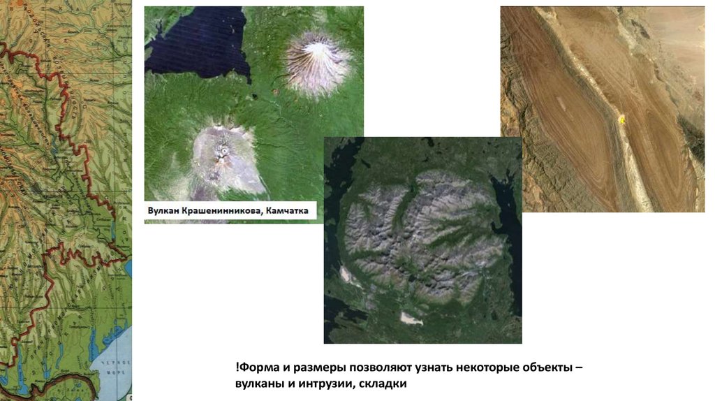 !Форма и размеры позволяют узнать некоторые объекты –вулканы и интрузии, складки