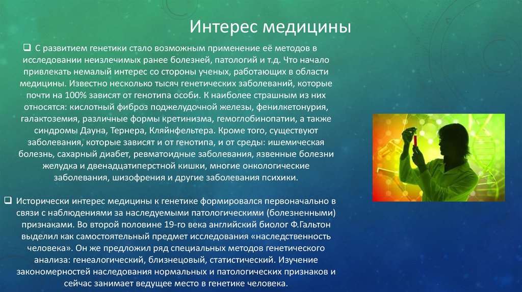 Интерес медициныС развитием генетики стало возможным применение её методов в