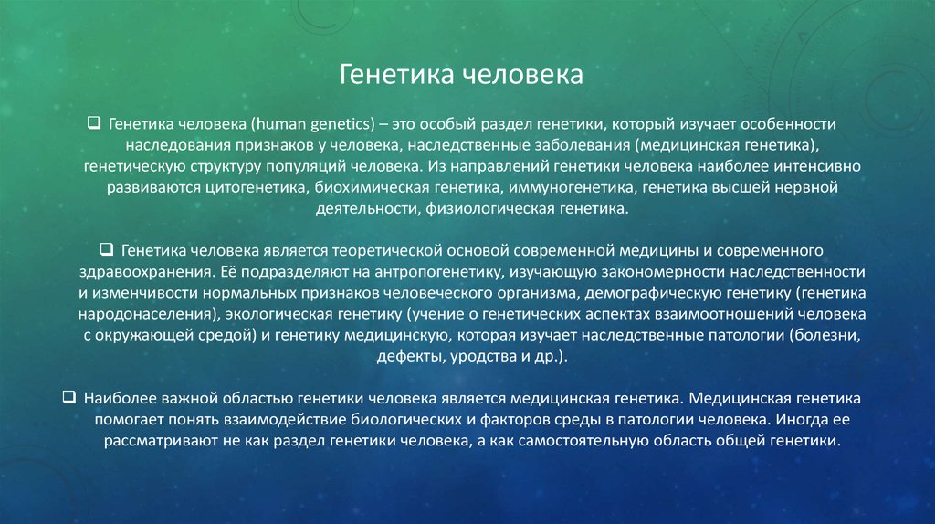 с окружающей средой) и генетику медицинскую, которая изучает наследственные патологии (болезни,