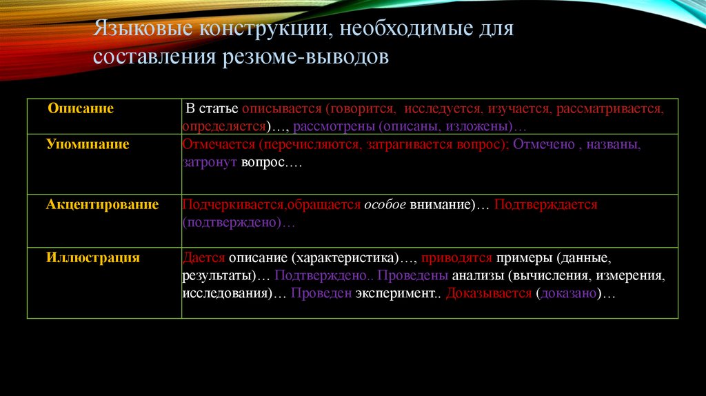 Языковые конструкции, необходимые длясоставления резюме-выводов