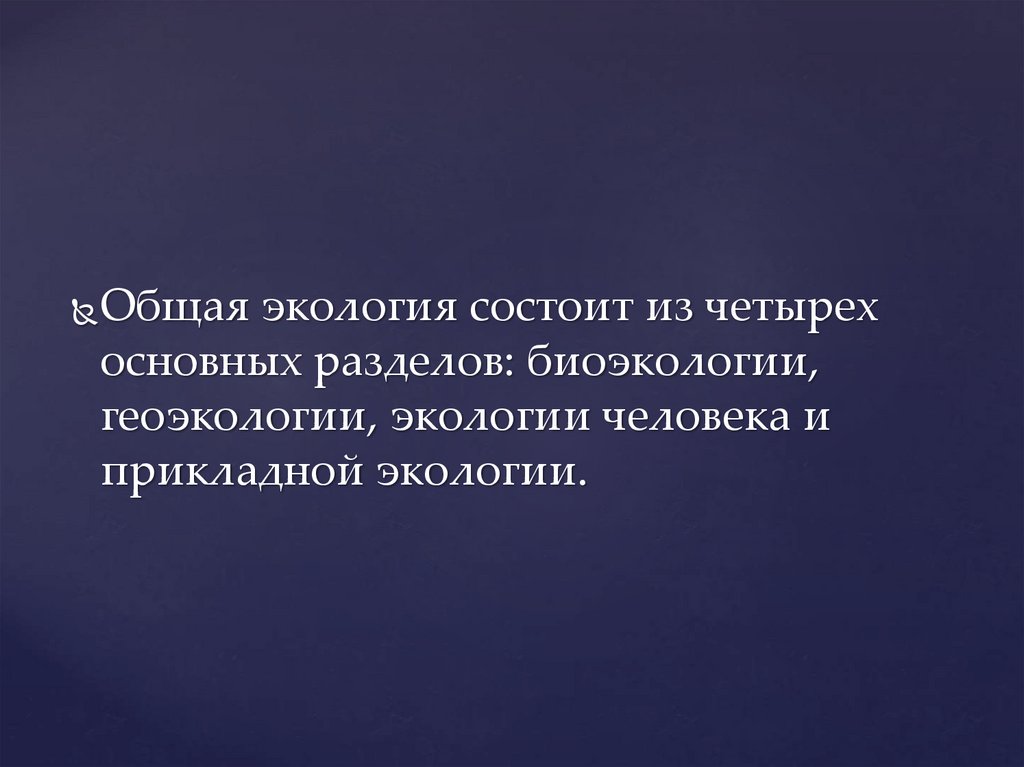 Общая экология состоит из четырехосновных разделов: биоэкологии,