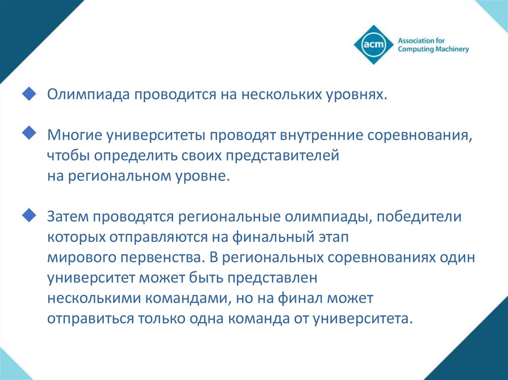 Олимпиада проводится на нескольких уровнях.Многие университеты проводят внутренние соревнования,