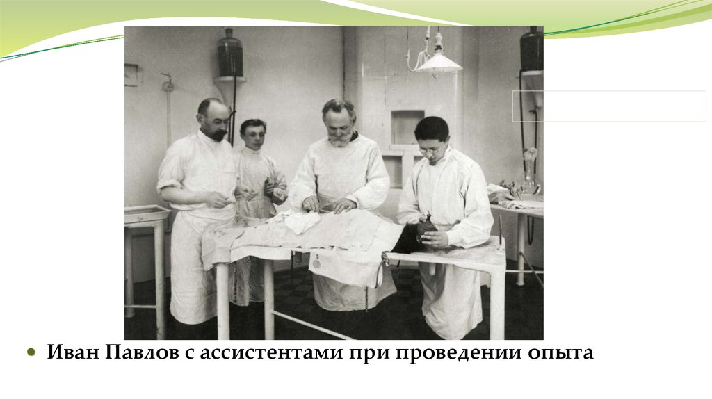 Иван Павлов с ассистентами при проведении опыта9.