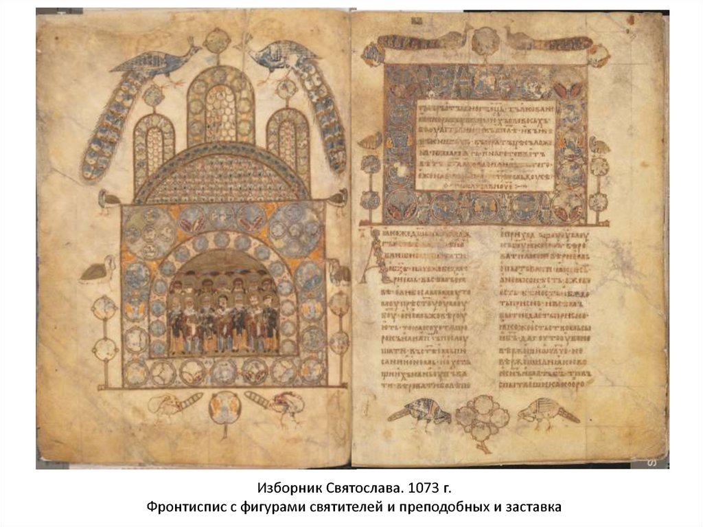 Изборник Святослава. 1073 г.Фронтиспис с фигурами святителей и преподобных и заставка