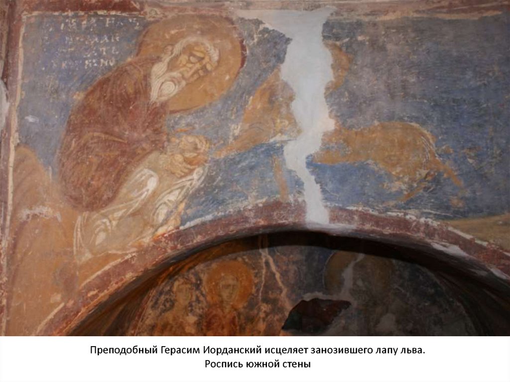 Преподобный Герасим Иорданский исцеляет занозившего лапу льва.Роспись южной стены