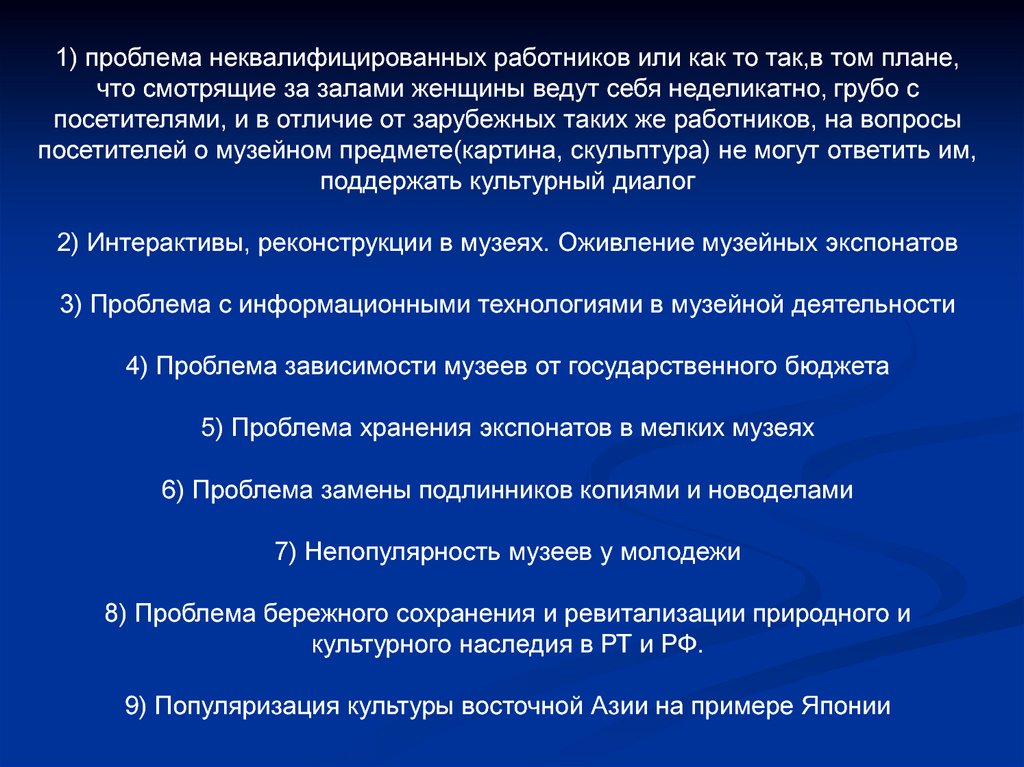 1) проблема неквалифицированных работников или как то так,в том плане,что смотрящие за залами женщины ведут себя неделикатно, грубо с