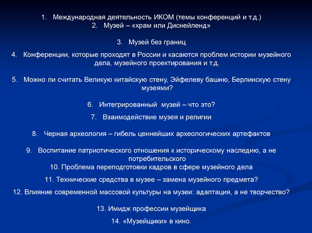 1. Международная деятельность ИКОМ (темы конференций и т.д.)2. Музей – «храм или Диснейленд»