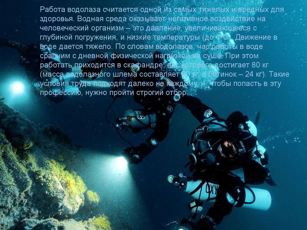 Работа водолаза считается одной из самых тяжелых и вредных дляздоровья. Водная среда оказывает негативное воздействие на