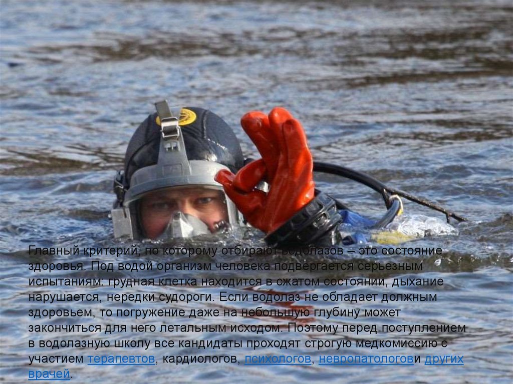 Главный критерий, по которому отбирают водолазов – это состояниездоровья. Под водой организм человека подвергается серьезным